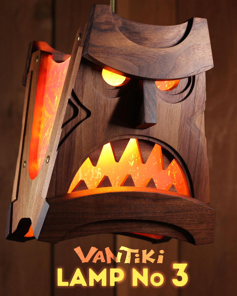 Designed and built by VanTiki, Lamp number 3 features two distinct sides: the slumbering idol and the angry idol! This lamp measures 12” tall and 10.25” at base and top. It weighs 5lb 11oz wired with bulb. Crafted from walnut and sapele wood with mahogany tenons, the hanging lamp features solid brass and powder coated steel hardware. Frosted acrylic side panels diffuse the glow of a flickering flame LED bulb. Available either wired with LED bulb and ready to hang by the cloth braided cord or un-wired ($50 deduction from final total due). Production begins in late December/early January.